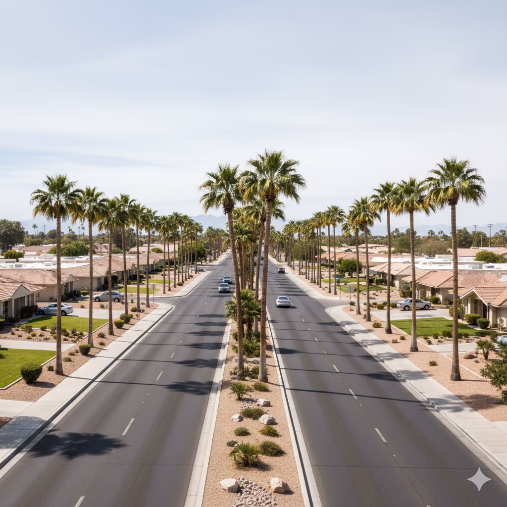 Sun City is a large retirement community in the Northwest Valley, located between Loop 101 and US-60 corridors. While primarily residential, Sun City sees regular commercial vehicle traffic for healthcare deliveries, property services, retail distribution, and construction support. The Grand Avenue corridor provides strategic freight access through the Northwest Valley.